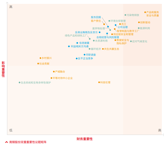 公司設立“環(huán)境友好、治理一流、科創(chuàng)引領、共生共贏”的 ESG 戰(zhàn)略目標,明確可持續(xù)發(fā)展的方向和定位,著力提升 ESG 管理水平。圍繞戰(zhàn)略目標,公司構建“創(chuàng)新發(fā)展與卓越產品、共享發(fā)展與員工成長、綠色發(fā)展與環(huán)境友好、公司治理與共贏發(fā)展、和諧關系與社會責任”五大可持續(xù)發(fā)展層面,將科技創(chuàng)新與數字化轉型深度融入經營管理全過程,強化核心競爭力,推動公司高質量發(fā)展。公司堅持“為員工謀幸福、為顧客謀發(fā)展、為股東增回報、為社會擔責任、為相關方創(chuàng)共贏”的價值導向,持續(xù)深化可持續(xù)發(fā)展使命,朝著企業(yè) ESG 愿景穩(wěn)步前行。